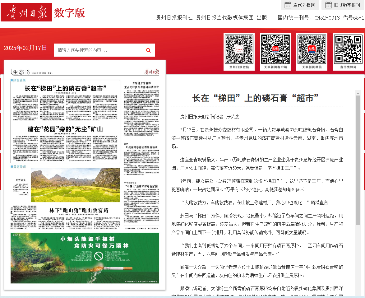 2月12日,在貴州捷眾森建材有限公司,一輛大貨車載著30余噸建筑石膏粉、石膏自流平等磷石膏建材從廠區(qū)駛出,將貴州息烽的磷石膏建材運往云南、湖南、重慶等地市場。